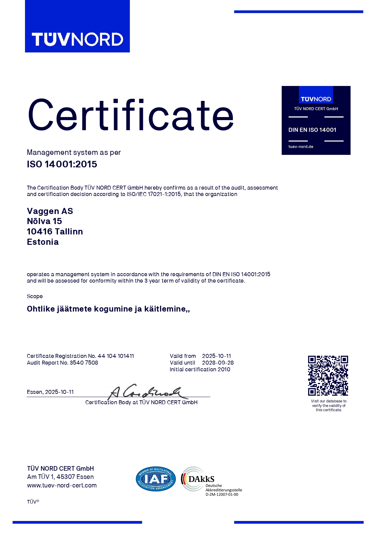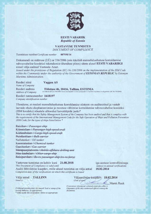 Our company is fully approved and certified by Estonian Authorities to handle oil residues ashore or at sea: